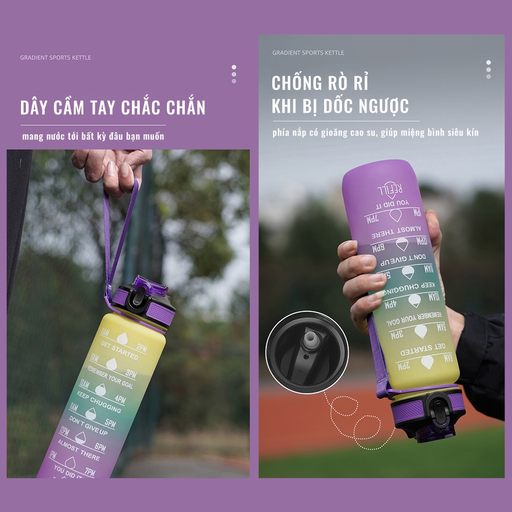 👍😍TÍNH NĂNG NỔI BẬT: ✅ CHẤT LIỆU CAO CẤP VÀ AN TOÀN - Sử dụng nhựa TRITAN là loại nhự cao cấp nhất. ✅ CÓ VẠCH BÁO GIỜ UỐNG NƯỚC VÀ VẠCH CHIA ML ✅ PHONG CÁCH THỂ THAO VÀ TRẺ TRUNG - Được làm với màu sắc Gradient mang lại cho chiếc bình phong cách năng động và trẻ trung. ✅ DỄ SỬ DỤNG: Thao tác mở có thể được thực hiện bằng một nút ấn rất đơn giản. ✅ DỄ MANG THEO: Đi kèm với dây cầm tay, cho phép bạn treo nó vào túi xách hoặc mang theo một cách tiện lợi, dễ dàng bảo quản. Lý tưởng là mang BÌNH ĐỰNG NƯỚC này để sử dụng trong văn phòng, phòng tập thể dục, tập gym, trường học, đi xe đạp, du lịch, leo núi hoặc các hoạt động trong nhà hoặc ngoài trời khác. ✅ QUÀ TẶNG TUYỆT VỜI – BÌNH ĐỰNG NƯỚC cầm tay này là một món quà lý tưởng cho bạn bè, sinh viên, trẻ em, người chơi thể thao,....