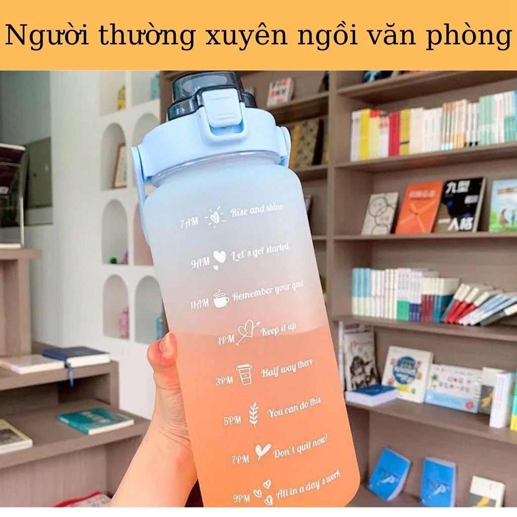 Bình Nước Chia Vạch Giờ Nhắc Uống Nước Dung Tích 2 Lít Có Ống Hút Nắm Chống Tràn