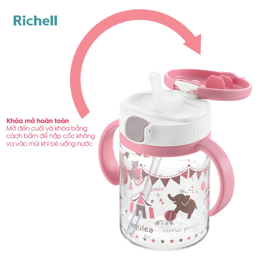 Bình ống hút AQ Richell là sản phẩm thuộc thương hiệu cao cấp đến từ đất nước mặt trời mọc (Nhật Bản) hiện đang được đông đảo các bà mẹ thông thái khắp thế giới tin dùng. Chịu lực tốt, chống rò 100%. Phù hợp với bé trên 7 tháng tuổi. Thân bình ống hút AQ Richell được làm từ nhựa Polyester cao cấp có độ bền và độ trong cao, không chứa BPA hay bất kỳ chất độc hại nào ảnh hưởng tới bé. Vòi hút bằng silicone mềm mại, nhẹ nhàng với răng, lợi bé. Toàn bộ hệ thống ống hút nằm trọn dưới nắp gập liền thân có lẫy đóng – mở tiện dụng vừa đảm bảo vệ sinh, vừa không lo thất lạc nắp. Lẫy bật mở rất nhẹ, không lo đập vào miệng hay mặt bé khi tiếp xúc gần. Có khả năng chống rò 100%, đầu hút chỉ tiết nước khi bé hút. Kết hợp với nắp đậy chắc chắn, bình phù hợp cho mọi hoạt động khám phá của bé, kể cả khi bé dốc ngược hay cầm bình chạy nhảy, thuận tiện cho mẹ khi mang theo ra ngoài. Tay cầm có thể tháo rời khi không sử dụng, hoặc trở thành bình nước cho mẹ khi bé lớn lên với thiết kế đẹp mắt. Bổ sung vạch chia dung tích (ml) trên thân giúp mẹ dễ dàng theo dõi lượng nước bé uống hoặc khi muốn pha sữa trực tiếp vào bình. Lưu Ý Sử Dụng Bình Ống Hút AQ Richell Các bộ phận dễ dàng tháo rời để vệ sinh. Độ chịu nhiệt: Thân bình là 110 độ C; Tay cầm và nắp là 120 độ C; Ống hút là 140 độ C. Tiệt trùng bằng cách luộc sôi, tráng nước nóng hoặc dung dịch tẩy rửa nhẹ. An toàn với ngăn trên cùng của máy rửa bát. Không tiệt trùng bằng lò vi sóng. Có thể sử dụng tiệt trùng bằng tia UV Không để sản phẩm dưới ánh nắng trực tiếp hoặc gần nguồn nhiệt.
