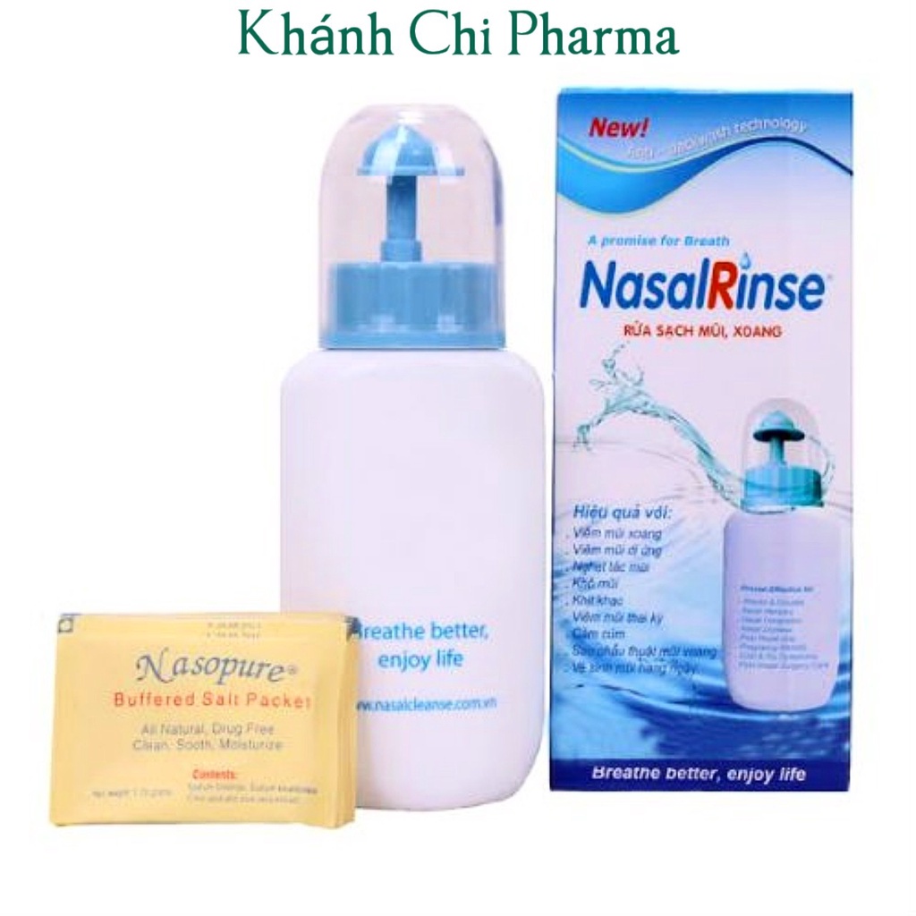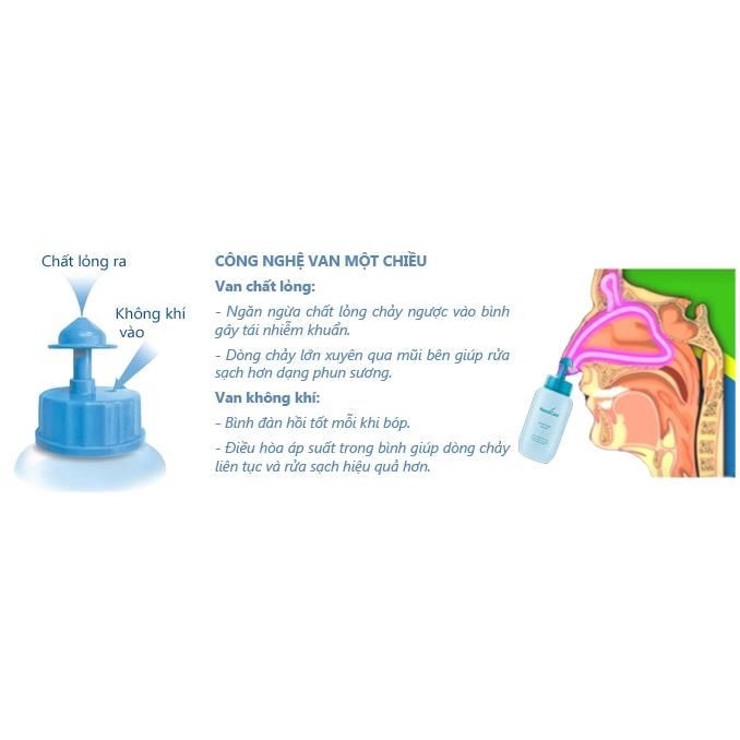 Bình rửa mũi Nasal Rinse: là sản phẩm duy nhất được cấu tạo với hệ thống van 1 chiều ngăn cản sự nhiễm bẩn trở lại. Bình rửa mũi Nasal Rinse được sản xuất tại Việt Nam và kiểm định chất lượng an toàn cho bé. Van khí có tác dụng ngăn ngừa áp lực âm khi ta bóp chai giúp quá trình rửa được liên tục . Van nước chỉ cho dung dịch đi một chiều. Hai van này hoạt động song song và phối hợp giúp quá trình rửa mũi trở nên dễ dàng và hiệu quả hơn. 1. Thông tin sản phẩm * 1 bộ dụng cụ rửa mũi Nasal Rinse gồm - 1 dụng cụ rửa mũi Nasal Rinse Provix 240ml. - 10 gói muối Nasopure 3g. 2. Hướng dẫn sử dụng Bình rửa mũi Nasal Rinse: 1. Rửa sạch tay 2. Tháo nắp bảo vệ khỏi chai rửa 3. Cắt gói hỗn hợp ở góc đổ toàn bộ vào bình rửa 4. Rót nước vào bình rửa ngang mức 240ml 5. Vặn chặt nắp vào chai , đặt một ngón tay bị kín miệng của lỗ rửa , nhẹ nhàng lắc khi hỗn hợp tan hết. 6. Nghiêng người về phía chậu rửa , nhẹ nhàng đặt một đầu rửa vào bên mũi 7. Há miệng, thở bình thường 8. Bóp nhẹ nhàng bình rửa 2 lần , mỗi lần 60ml rồi chuyển sang mũi còn lại 9. Xì mũi nhẹ nhàng 10. Để có kết quả tốt nhất nên rửa mũi 2 lần mỗi ngày