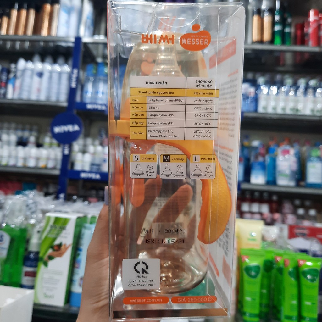 -Bình sữa cổ rộng Wesser PPSU dành cho bé từ 4-6 tháng 260ml có kiểu dáng đẹp và bền, nhờ thiết kế lượn sóng ở giữa thân bình cùng trọng lượng siêu nhẹ, giúp bé dễ cầm nắm. -Sử dụng núm vú silicone loại siêu mềm, có lỗ thông hơi thông minh giúp giảm tình trạng đầy hơi ở trẻ. ƯU ĐIỂM CỦA BÌNH SỮA CỔ RỘNG WESSER: - Bình sữa Wesser PESU là sự kết hợp giữa thiết kế đột phá và chất liệu cao cấp nhất. - Nhựa PESU có độ kháng va đập, kháng nhiệt và hóa chất vượt trội. Không chứa BPA. - Sử dụng núm vú silicone loại siêu mềm, có lỗ thông hơi thông minh giúp giảm tình trạng đầy hơi ở trẻ. - Bình có tay cầm cầm đẹp chắc chắn, có thể tháo rời. HƯỚNG DẪN SỬ DỤNG: - Tiệt trùng bình sữa, núm vú từ 1 đến 3 phút trước khi sử dụng - Nên có 3 bình sữa và núm vú để thay đổi cho bé - Không nên sử dụng bình sữa và núm vú quá cũ vì không tốt cho sức khỏe của bé - Sử dụng núm vú cho phù hợp với lứa tuổi của bé - Thường xuyên kiểm tra bình sữa, núm vú để phát hiện và thay thế nếu bình sữa hoặc núm vú bị hư hoặc bị rách - Phải có sự giám sát cửa người lớn khi cho bé bú