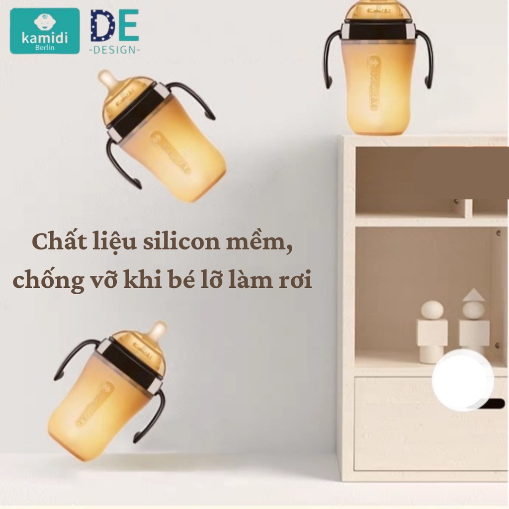 - Ưu điểm nổi bật: + Bình sữa silicon KAMIDI được thiết kế thông minh dưới dạng núm sữa mềm mại, mô phỏng đầu ti mẹ, tạo cảm giác như đang ti mẹ cho bé + Hỗ trợ bé tập bú bình và cai sữa hiệu quả + Cực kì an toàn do chất liệu silicon cao cấp mềm mại và không chứa BPA + Thiết kế núm sữa đa dạng phù hợp với độ tuổi của bé + Bình sữa chịu nhiệt cực kì tốt từ -20 độ đến 180 độ C