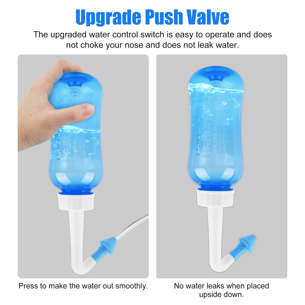 Đặc điểm kỹ thuật: Loại sản phẩm: Máy tưới mũi Dung tích: 300ml Sử dụng: 2.7g / gói rửa mũi muối dùng cho 300ml nước ấm. Sử dụng các mẹo: 1. Đổ một gói muối rửa mũi vào chai nước, sau đó thêm nước ấm vào bình. 2. Vui lòng đảm bảo nhiệt độ nước khoảng 37℃. Nếu chạm vào đầu ngón tay thì cảm thấy ấm áp hơn.Trộn đều muối rửa mũi cho đến khi hòa tan hoàn toàn, sau đó vặn chặt nắp. 3. Chọn đúng vòi phun: Hãy chắc chắn chọn mẹo rửa mũi cho trẻ.Trẻ em không thể sử dụng mẹo người lớn. 4. Tư thế đúng: Có phần trên cơ thể nghiêng về phía trước, nhìn xuống, và đầu hơi nghiêng một bên, Giữ ngược chai, và nhẹ nhàng nhét đầu vào một lỗ mũi.Thư giãn, mở miệng nhẹ và thở (qua miệng).Không nín thở, KHÔNG hít thở bằng mũi.Nhấn nút van ở dưới cùng của bình nước (Figure 1), và dung dịch sẽ tự động chảy.Không bóp bình nước. Dung dịch rửa sạch sẽ vào mũi và tắm cho mũi và xoang và thoát ra lỗ mũi khác khi gội đầu bằng mũi mới, xả sạch nút này để ngăn dung dịch lại.Xoay để rửa cả hai lỗ mũi. Đặc điểm: Chất liệu an toàn môi trường chai trong suốt, dễ quan sát Bảo vệ sức khỏe, làm sạch vi khuẩn khoang mũi Có 2 vòi phun, một đầu phù hợp cho người lớn, một đầu cho trẻ em Dễ dàng mang theo, thuận tiện khi sử dụng Mẹo ấm: không sử dụng nước tinh khiết hoặc muối ăn được thay vì muối rửa mũi Không nói chuyện và hít thở miệng khi bạn giặt