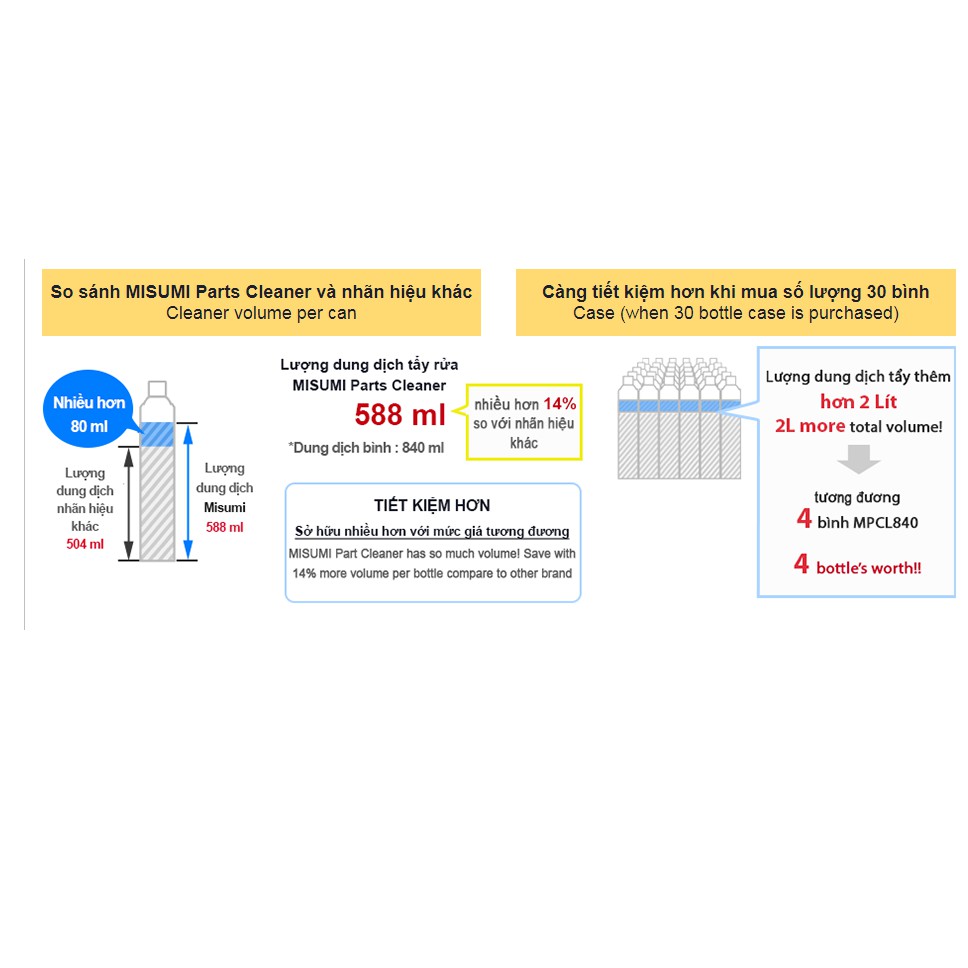 Bình xịt tẩy rửa công nghiệp MPCL840-1 hãng Misumi Nhật Bản Thông tin chi tiết về sản phẩm Bình xịt tẩy rửa công nghiệp chất lượng cao từ thương hiệu MISUMI Nhật Bản với chức năng "Phun ngược". Phun khi cả khi bình ở vị trí đảo ngược giúp bạn dễ dàng sử dụng mà không bị gián đoạn. Sản phẩm tẩy rửa mạnh và nhanh khô. Dung tích lớn, loại bột giặt mạnh, nhanh khô. Sử dụng để tẩy dầu nhờn, mỡ và sáp dính trên các bộ phận và khuôn kim loại và tẩy vecni xanh sau khi đánh dấu công việc. Bình xịt có thể được sử dụng ngay cả khi lon ở vị trí bị lật ngược.