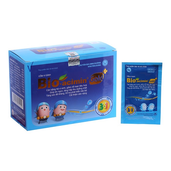 - Cốm vi sinh Bio-acimin Gold chứa chủng lợi khuẩn dạng bào tử gồm Lactobacillus, Bacillus subtilis, Bacillus clausii và 1 nấm men Saccharomyces boulardii. Nhờ ưu điểm vượt trội là khả năng sống sót qua môi trường acid của dịch vị dạ dày và khả năng kháng kháng sinh, bào tử lợi khuẩn bảo toàn số lượng vào đến ruột.