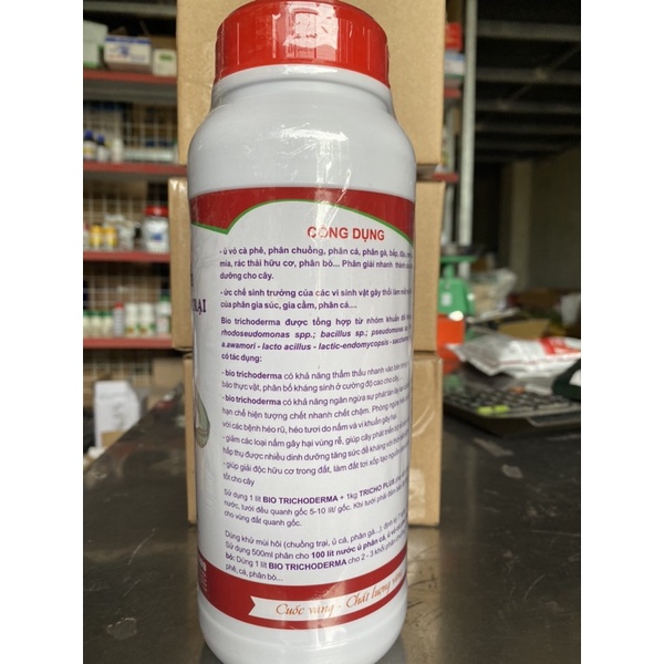 Ủ rác thải hữu cơ, phân chuồng, phân cá, phân gà, phân bò... Phân giải nhanh thành dinh dưỡng cho cây trồng. Bio Trichoderma có khả năng thẩm thấu nhanh vào bên trong các tế bào thực vật,phân bổ kháng sinh ở cường độ cao cho cây Bio Trichoderma có khả năng ngăn ngừa sự phát tán lây lan của nấm,hạn chế hiện tượng chết nhanh,chết chậm. Phòng ngừa hiệu quả với các bệnh héo rũ do nấm và vi khuẩn gây hại. Giảm các loại nấm gây hại vùng rễ, giúp cây trồng phát triển bộ rễ bền vững, hấp thụ được nhiều dinh dưỡng, tăng sức đề kháng với thời tiết bất lợi. Giúp giải độc hữu cơ trong đất,làm đất tơi xốp tạo nguồn dinh dưỡng tốt cho cây trồng. Hướng dẫn sử dụng; Dùng 1 lít Bio Trichoderma pha 400-500 lít tưới đẫm sung quanh gốc cây. Dùng khử mùi hôi chuồng trại ,ủ phân cá , phân gà dùng 1lít Bio Trichoderma pha 200 lít tưới đều lên phân cá vỏ cà phê phân bò … hoặc 1 lít Bio Trichoderma. cho 1-3 khối phân .