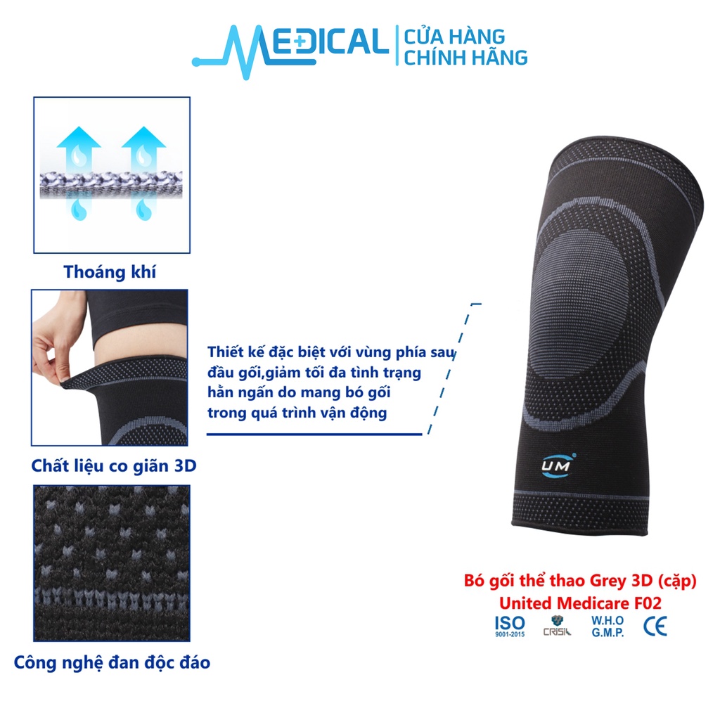 Bó gối thể thao 3D Grey UNITED MEDICARE - THÔNG TIN SẢN PHẨM - Sản phẩm: Bó gối thể thao 3D Grey United Medicare F02 - Hãng sản xuất: United Medicare - Model: F02 - Màu sắc: Đen - Chỉ định: + Không đau hoặc đau rất ít khi vận động nhiều hoặc nặng, đau khớp khi chơi thể thao + Sau phẫu thuật hoặc sau khi dùng thuốc giảm đau + Viêm mô mềm mãn tính + Sưng tái phát hoặc đau liên quan đến trọng lượng cơ thể. + Mất ổn định mãn tính + Chấn thương sụn khớp + Thoái hóa khớp gối + Phòng ngừa chấn thương trong thể thao hoặc làm việc nặng