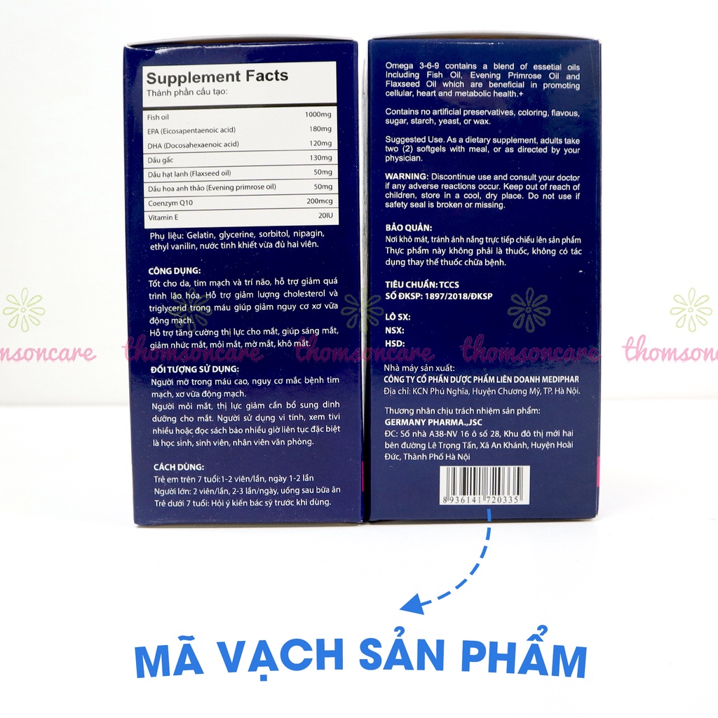 Viên uống sáng mắt, bổ não Omega 369 Ultra xanh biển - Hộp 100 viên có thêm dầu hoa anh thảo, Vitamin E đẹp da 🌟 Thomsoncare cam kết hoàn trả hàng miễn phí nếu có vấn đề phát sinh để bạn luôn đc yên tâm khi mua hàng ! 💲 Đơn hàng từ 50k luôn được hỗ trợ ship và Hoàn rất nhiều xu ạ ! 🌟 Với hơn 1 triệu lượt bán, +100.000 review 5 sao, Tóp 1 bán chạy nhóm ngành Sức khỏe, Mẹ và bé Thomsoncare rất tự hào là bạn đồng hành Chăm sóc sức khỏe của mọi nhà =======================