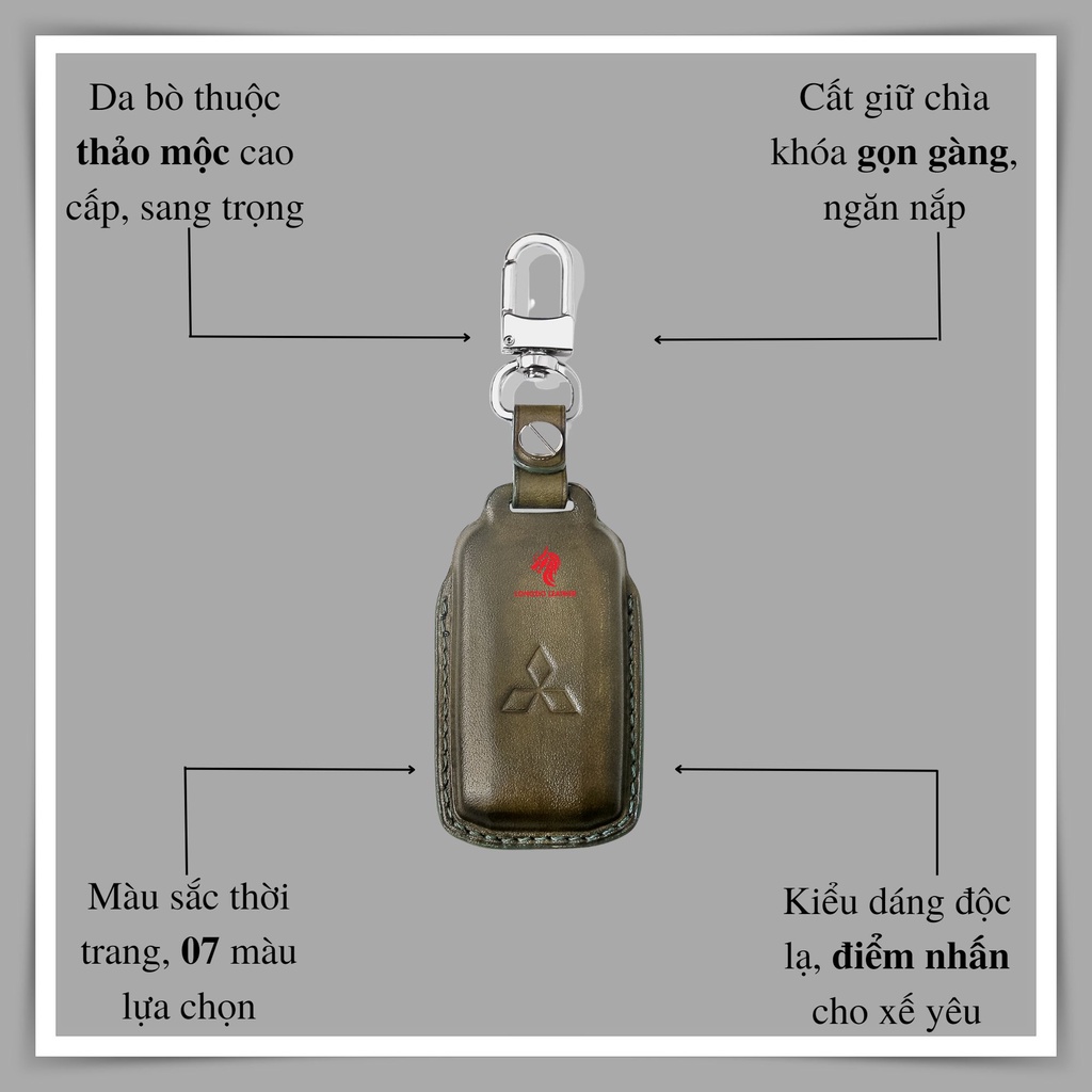 THÔNG TIN CHI TIẾT: - Tên sản phẩm: Bao chìa khóa xe ô tô - Dòng xe: Mitsubishi Xpander, được hoàn thiện thủ công may ôm sát chìa khóa - Màu sắc: 07 màu lựa chọn (Nâu bò, nâu chocolate, đen, xanh navy, xanh lá, xanh ô liu, đỏ tươi) - Chất liệu: Được chế tác từ da bò thuộc thảo mộc, móc khóa làm từ hợp kim chống gỉ cao cấp - Bộ sản phẩm gồm: 01 Bao da, 01 móc kim loại không gỉ Bọc chìa khoá xpander