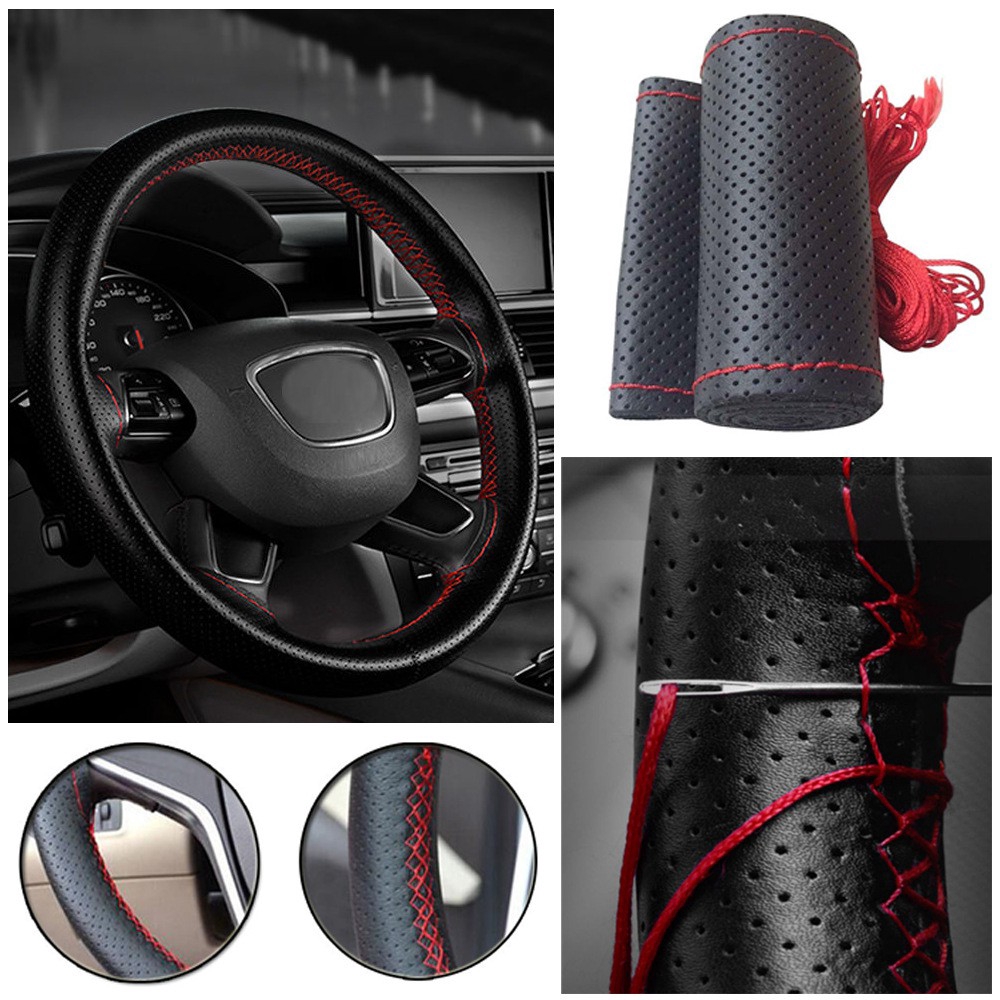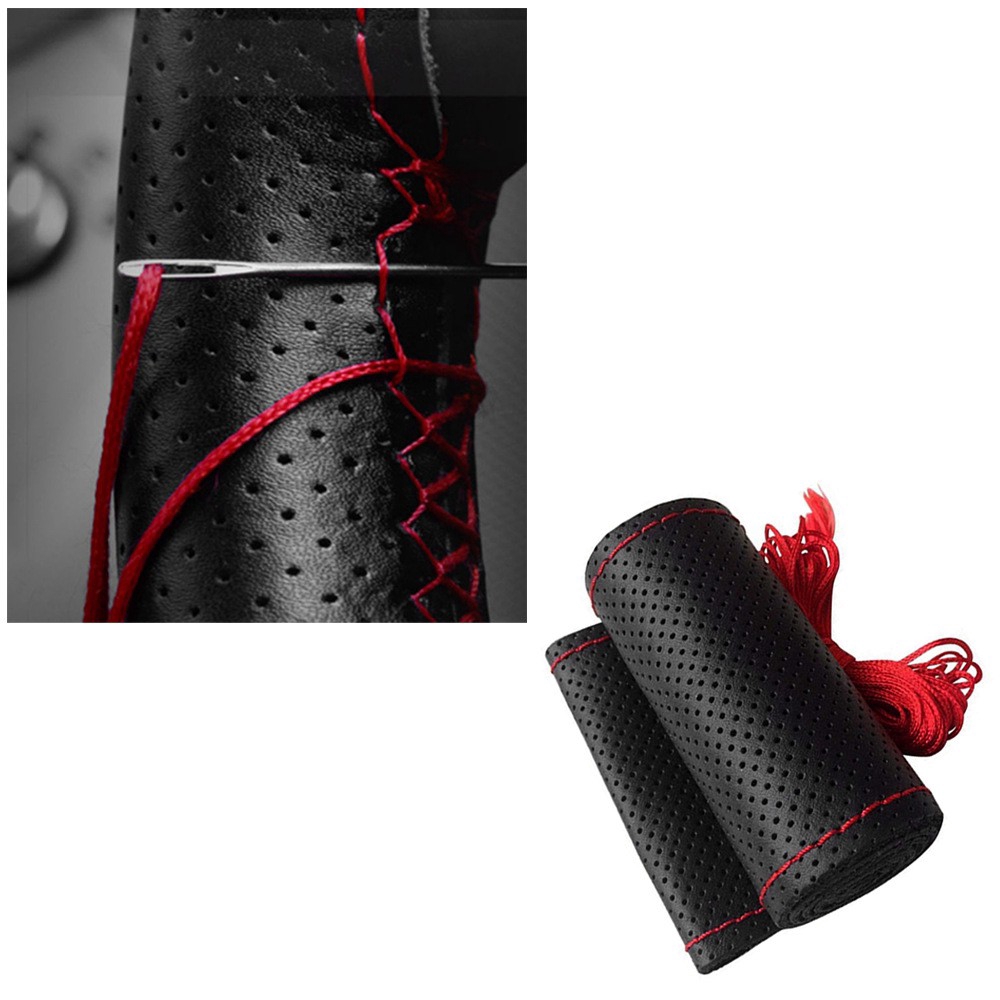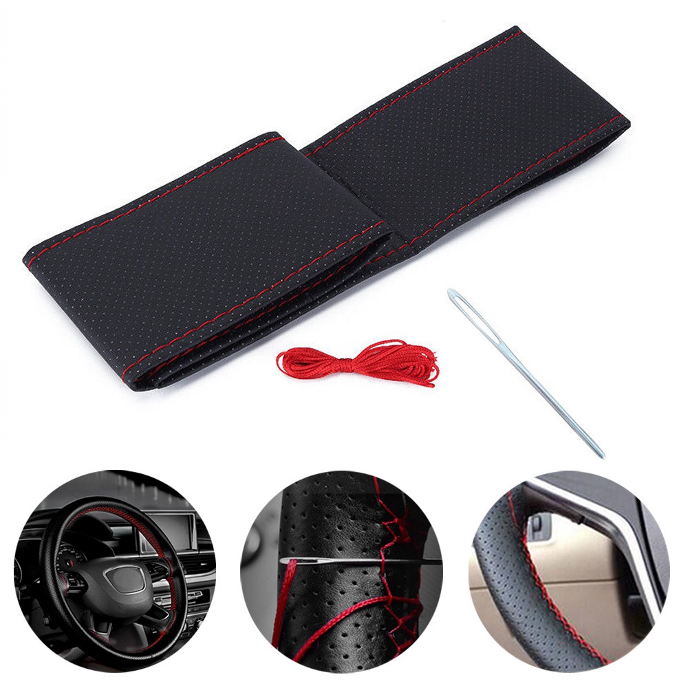 *Steering Wheel Cover is made of PU leather, high quality and durable. *Bring your car an unique and deluxe look. *Comes with needle and thread for DIY. *Material:PU (Polyurethanes Leather) *Color: Black leather +Red Thread (As Pictures Show) *Outer Diameter: Approx38cm/14.96'