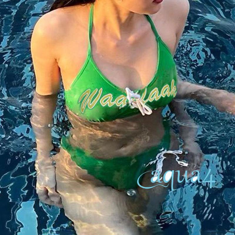 Thiết KẾ ĐỘC ĐÁO: Bộ đồ tắm thời trang và quyến rũ, áo ngực viền cổ hai dây in chữ, và quần bơi buộc dây.