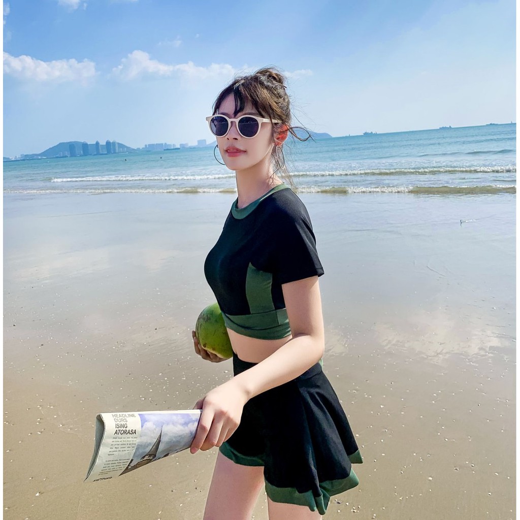 Bộ đồ bơi nữ bikini đi biển croptop cộc tay dáng váy kín đáo tôn dáng