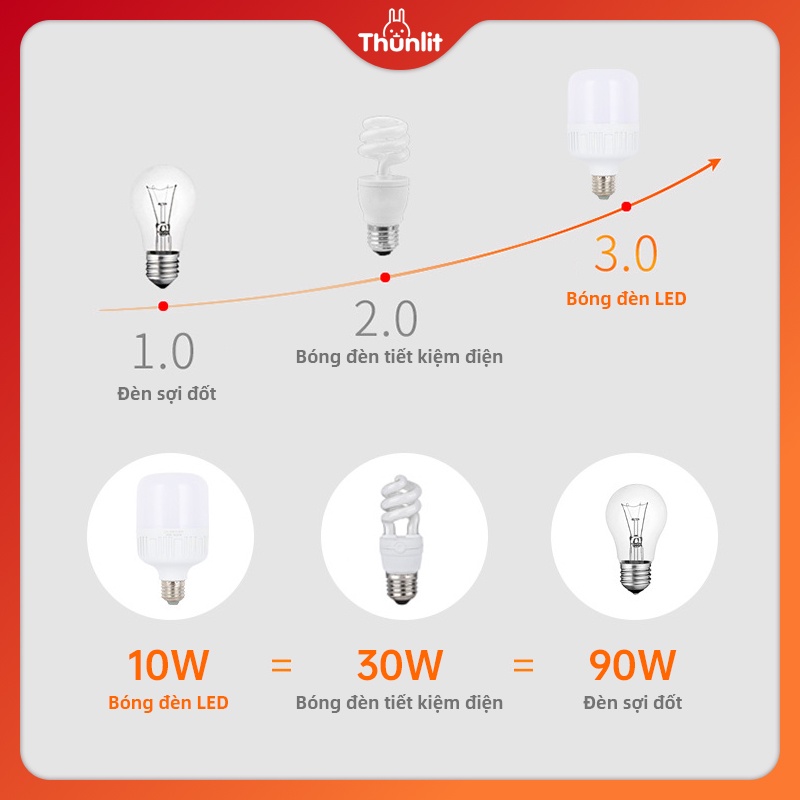 Các đặc điểm kỹ thuật của bóng đèn LED Thunlit Tên sản phẩm: Bóng đèn LED Thunlit Chất liệu: ABS + PP Loại chuôi: E27 Kích thước: 60 * 116mm (đường kính * chiều cao) Màu sắc: Trắng CRI (Ra>): khoảng 80 Nguồn sáng: LED Công suất: 10 watt Quang thông: 1800lm Điện áp đầu vào: 220V Khối lượng: 50g Thời gian hoạt động: 10000 giờ Chức năng: Độ lên màu cao, tuổi thọ cao, không chập chờn, tiết kiệm năng lượng