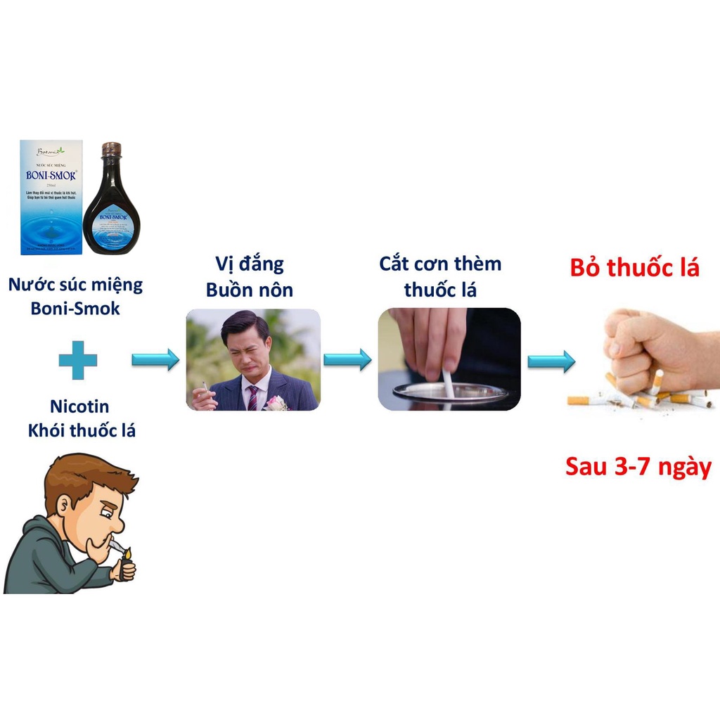 Cách Dùng Boni-Smok: - Ngày súc miệng 2-3 lần, mỗi lần 10-20 ml trước khi hút t.hu.ố.c. - Súc miệng trong khoảng 30 giây. - Không được uống