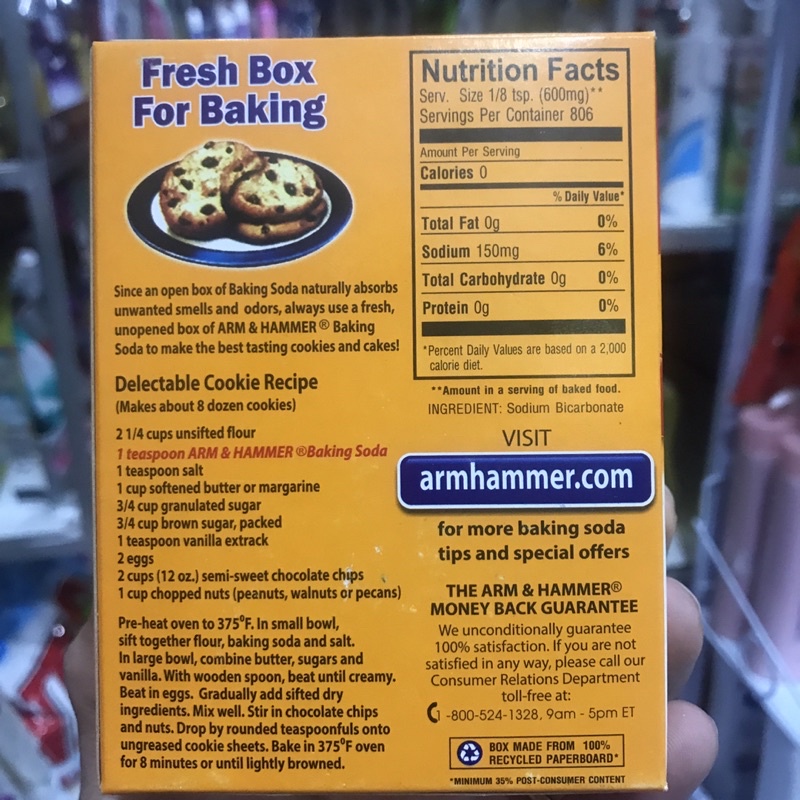 1.Khử mùi hôi trong tay. Khi bạn cắt tỏi, hoặc rửa cá v.v.., mùi vị của nó sẽ bám chắc vào tay của bạn. Tay rửa sạch với nước, dùng hai muỗng cà phê baking soda thay vì xà phòng, chà mạnh và sau đó rửa sạch với nước, các mùi khó chịu từ cá, tỏi và các mùi khác sẻ không còn nửa 2 .Ngâm các loại hoa quả và rau tươi vào một chậu nước sạch có pha thêm 1/4 cốc bột baking soda để loại bỏ bụi bẩn và thuốc trừ sâu, chất bảo quản. Rửa sạch lại với nước. 3. Khử mùi vật dụng trong nhà. - Để khử mùi của chiếc găng tay cao su mà bạn vừa sử dụng để rửa bát, hãy dùng một chút baking soda để rửa trước khi dùng xà phòng, nước rửa tay. - Khử mùi gấu nhồi bông, rắc một lớp bột baking soda mỏng lên chúng, để yên khoảng 15 phút để loại bỏ tất cả mùi hôi. - Khử mùi tủ quần áo của bạn bằng cách đặt một hộp baking soda đã mở nắp bên trong. - Khử mùi hôi trong giày dép bằng cách đặt một túi bột baking soda nhỏ trong giầy hoặc rắc bột trực tiếp vào bên trong rồi phủi sạch bột. -Để loại bỏ mùi hôi trong tủ lạnh hoặc hộp nhựa đựng thức ăn, đặt vào trong đó một túi bột baking soda mở nắp để hút mùi. - Hộp đựng thức ăn: Khi không sử dụng, cho một ít baking soda vào trong hộp. - Thảm: Rắc baking soda lên thảm rồi để qua đêm (lâu hơn càng tốt). Ngày hôm sau vun hốt hết baking soda còn dư rồi hút bụi cho sạch. 4. Công dụng tẩy rửa. - Để rửa những chiếc chảo chống dính, hãy cho vào chảo một ít Baking soda (thuốc muối, có bán ở hàng nguyên liệu làm bánh), thêm nước và ngâm một lúc trước khi rửa thay vì cọ mạnh tay làm hỏng lớp chống dính. - Bồn tắm, bồn rửa bát, sàn gạch: Pha baking soda + muối hạt + nước rửa bát thành hỗn hợp bột nhão rồi thấm vào miếng bọt biển để cọ sạch. - Nồi chảo bám dính dầu mỡ, vết bẩn: Pha 2 thìa baking soda và nước rửa bát với nước rồi ngâm nồi chảo. Nếu sau khi rửa đồ ăn vẫn còn bám dính thì đổ bột baking soda lên một miếng bọt biển ướt rồi chà cho hết. - Miếng bọt biển rửa bát: ngâm vào dung dịch baking soda đậm đặc ( 4 thìa baking soda hòa trong 1 lít nước ấm) - Lò vi sóng: Rắc baking soda lên một miếng bọt biển rối chùi sạch lò vi sóng cả trong và ngoài. Sau đó dùng khăn ẩm để lau ạch. - Bình cà phê, bình trà: rửa với dung dịch gốm ¼ chén baking soda pha vào một 1 lít nước ấm. Để chà sạch các vết khó tẩy thì dùng một miếng bọt biển ướt có rẳc baking soda. - Bàn ghế và tường bám bẩn (vết bút chì, thức ăn, vết sơn...): rắc baking soda lên một miếng bọt biển ướt rồi chùi nhẹ. Sau đó lau lại bằng khăn khô và sạch. - Sử dụng hỗn hợp cơ bản trên (bột baking soda trộn với nước ấm) và một miếng bọt biển để rửa sạch tất cả các bề mặt trong phòng bếp. - Đánh bóng đồ dùng bằng bạc với hỗn hợp bột baking soda và nước ấm, hòa tan theo tỷ lệ 3/1. 6. Phòng giặt. - Muốn sợi vải trên quần áo sáng lên chỉ cần đổ thêm một cốc bột baking soda vào chung khi giặt. - Đối với chất liệu lông và khăn bông, thêm 1/2 cốc bột baking soda vào chu kỳ nước cuối cùng để quần áo được mềm mại hơn. Xuất xứ: Mỹ Hạn sử dụng: 3 năm kể từ ngày sản xuất
