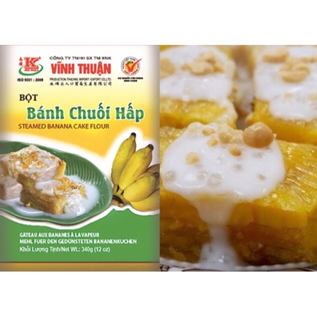 THÀNH PHẦN: BỘT NĂNG , BỘT GẠO CÁCH LÀM: - Hòa tan 340g bột với 510 ml nước, khuấy cho bột tan đều. Bột bánh chuối hấp VĨNH THUẬN. 340g - Chuối sứ chín ( 2 kg ) cắt mỏng khoảng 1cm, ướp thêm đường 200g - 230g( tùy sở thích ). - Cho tất cả (bột, chuối, đường) vào nồi và đặt lên bếp lửa nhỏ khuấy đều tới khi thấy hơi nặng tay (tức là bột đặc hơi sền sệt) là được. - Đổ hỗn hợp ra xửng, đã thoa dầu ăn - Đun nồi nước cho thật sôi,đặt xửng bánh vào hấp khoảng 20 phút là chín ( tùy theo bánh dày hay mỏng ). - Bánh chuối hấp dùng chung với nước cốt dừa nấu chín, mè rang