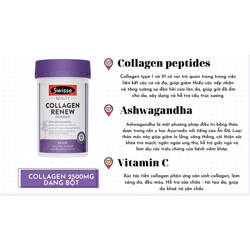 * Bột uống Swisse Beauty Collagen Renew Powder (Màu tím): - Giúp da căng mịn, chống lão hoá và giúp cơ thể giảm stress - Chứa Collagen Peptides, Vitamin C and Ashwagandha - Vị berry.