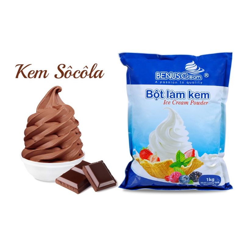 Đặc biệt với sản phẩm này bạn có thể chế biến cả kem tươi và kem cứng. Chất lượng kem vô cùng tự nhiên sánh mịn, tươi ngon, mát lạnh, độ bền cao, cấu trúc kem lâu tan chảy,Có rất nhiều các hương vị khác nhau cho bạn lựa chọn: dâu, socola, vani, sầu riêng, đậu xanh, dưa gang, khoai môn,cam... trên 30 hương vị khác nhau HƯỚNG DẪN SỬ DỤNG :Làm Bằng Máy Đối với kem tươi: Chỉ 1 kg bột làm kem hòa tan đều với 2.5 lít nước nóng ở nhiệt độ 70 độ C. Cho hỗn hợp nước bột kem vào máy làm kem tươi, chạy máy khoảng 10 phút bạn sẽ có ngay kem tươi. Với cách làm này rất tiết kiệm và tiện lợi cho các hệ thống cửa hàng kinh doanh kem. Đối với kem cứng: Cho 1 kg bột làm kem hòa tan đều với 2.5 lít nước nóng ở nhiệt độ 70 độ C bằng máy đánh trứng hoặc máy sinh tố. Cho hỗn hợp nước bột vào máy làm kem cứng chạy khoảng 15 phút, rồi sau đó cho vào tủ đông ở nhiệt độ -18 độ C. Sau từ 2 đến 3 giờ bạn sẽ có ngay kem cứng tươi ngon. Ngoài ra khách hàng có thể pha trộn thêm 1 hoặc 2 bịch sữa tươi cho 1 kg bột làm kem, giảm lượng nước dùng lại tương ứng với lượng sữa tươi bỏ vào. Làm như vậy kem sẽ đậm đà và ngon hơn rất nhiều. Hướng Dẫn Sử Dụng :Làm Thủ Công Bằng Tay Cách làm kem gia đình (không sử dụng máy làm kem): + Bước 1: Trộn 200g bột kem vào 400ml nước và khuấy đều cho tan. Sau đó bỏ hỗn hợp vào ngăn đá khoảng 3 -5 tiếng. + Bước 2: Lấy hỗn hợp kem đã đông đặc ra dằm nhỏ, cho thêm 150ml - 160ml nước ướp lạnh. Sau đó dùng máy đánh trứng đánh đều và nhuyễn trong thời gian 2-3 phút. Nếu muốn kem ngon hơn, ở bước 2 thay nước bằng sữa tươi hoặc nước trái cây ướp lạnh. Riêng bột kem vani có thể thêm trái cây tươi cắt nhỏ tùy theo ý thích + Bước 3: Sau đó bỏ hỗn hợp vào ngăn đá khoảng 6 - 8 tiếng. Bạn sẽ có những viên kem tuyện hảo và bổ dưỡng. Xuất xứ: việt nam Ngày sản xuất:in trên bao bì Hạn sử dụng: 12 tháng Sản phẩm của công ty BENUSCream.