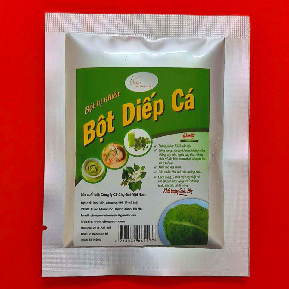 ✔️ Tên sản phẩm: Bột diếp cá nguyên chất ✔️ Thành phần: 100% diếp cá ✔️ Quy cách đóng gói: Túi pe/pp ✔️ khối lượng tịnh: 10g, 20g, 50g ✔️ Hạn sử dụng: 12 tháng. ✔️ Gói: Túi bạc, Pe/Ppp ✔️ Bảo quản: Nơi khô ráo, thoáng mát tránh ánh nắng mặt trời chiếu trực tiếp vào sản phẩm.