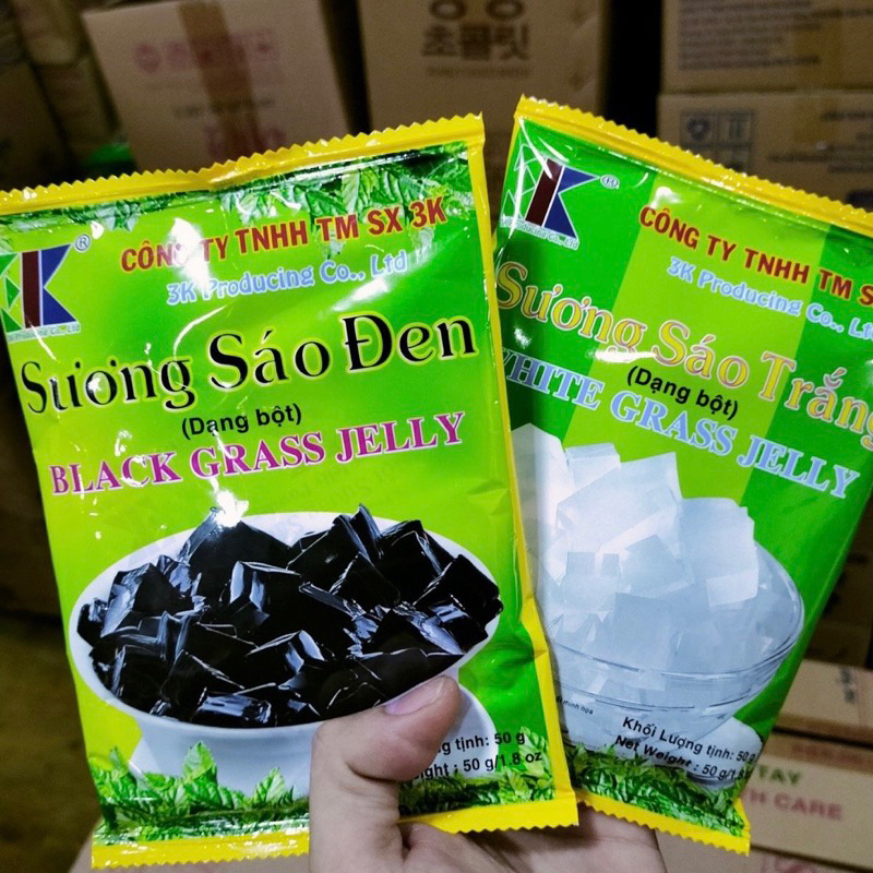 Bột Sương Sáo Đen 50g bao gồm: 1 gói bột sương sáo, 1 gói dầu chuối, 1 gói đường trắng. - Hướng dẫn sử dụng bột sương sáo đen: 1. Cho 50 gram bột sương sáo đen hòa tan với 200ml nước và khuấy hỗn hợp cho tan đều. 2. Đun sôi 800ml nước, cho hỗn hợp đã trộn khuấy đều cho đến khi hỗn hợp thành hồ. 3. Đổ ra khuôn hoặc chén để nguội, khi ăn có thể cho thêm đường, nước đá hoặc cho vào tủ lạnh sẽ mát và ngon hơn nhiều.
