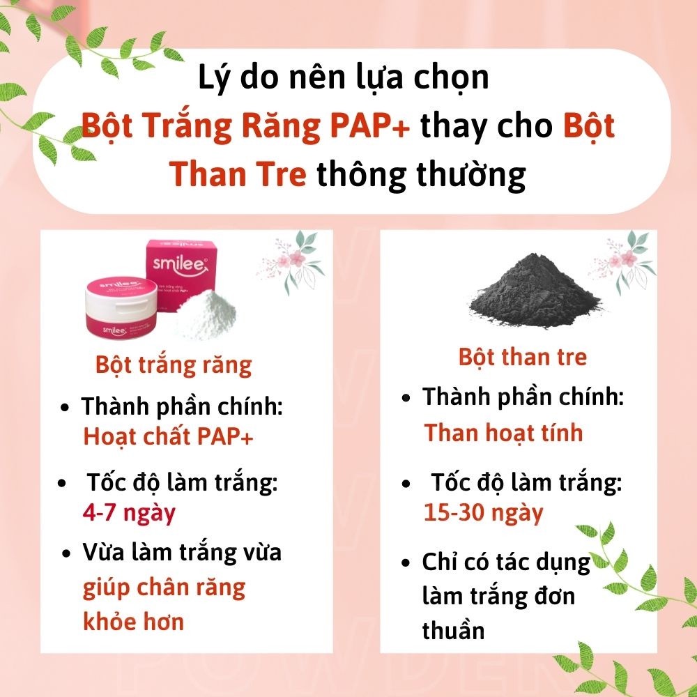 2. THÀNH PHẦN ĐỘC QUYỀN NHÀ SMILEE: - Khác với các loại bột than tre, bột trắng răng trên thị trường, BỘT LÀM TRẮNG RĂNG SMILEE chứa hoạt chất PAP+ - hoạt chất độc quyền giúp làm trắng nhanh và cực kỳ an toàn - Các thành phần khác từ thiên nhiên giúp ngăn ngừa sâu răng và hơi thở thơm mát hơn