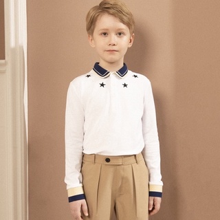 Áo polo cotton dài tay bé trai 137KIDS thiết kế màu trắng trơn phối cổ xanh ngôi sao