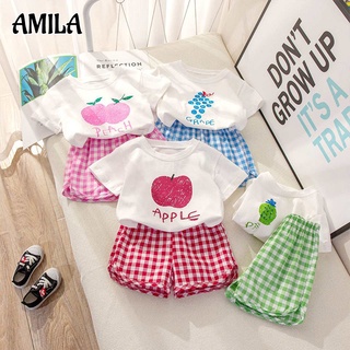 Set quần áo amila gồm áo thun ngắn tay in hình trái cây + quần short kẻ sọc caro dễ thương cho bé gái