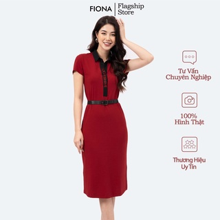 Đầm nữ dáng suông cổ Polo thêu chữ, váy cotton nữ dáng dài thắt đai eo FIONA F421203