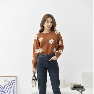 Áo len nữ bo gấu FIONA, Áo len cổ tròn dệt họa tiết bông hoa mã F852728