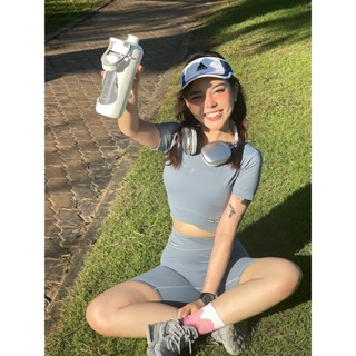Bộ đồ thể thao tập gym yoga Fitme áo thun croptop quần legging lửng phối xéo Fitme Cover23 xám xanh