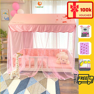 Giường Cho Bé Gái Hình Ngôi Nhà, Kèm Màn Chống Muỗi, Gỗ Quế Tự Nhiên GoldCat Cho Trẻ Từ 3-15 Tuổi,Tặng Sét Trang Trí.
