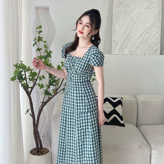 Đầm caro nữ cổ vuông, tay phồng - Xanh 4006 Guco