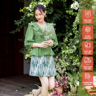 Váy cổ yếm Her25 váy dáng dài xếp ly màu xanh cốm