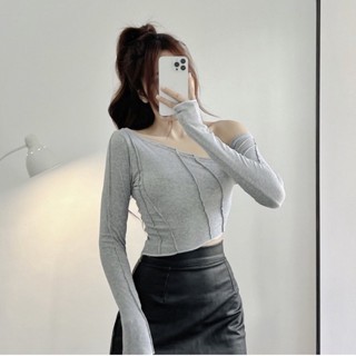Áo lệch vai tay dài chất liệu gân đũa co dãn I HHVINTAGE