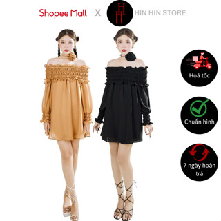 Đầm babydoll trễ vai nhún thun tay dài màu đen - màu nâu HDT309 Hỉn Hỉn Store