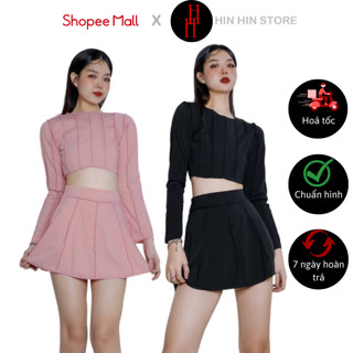 Set bộ áo croptop tay dài phối cung chân váy ngắn màu đen - màu hồng HS122 Hỉn Hỉn Store