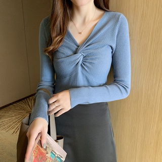 IELGY Áo Dệt Kim Mỏng Tay Dài Cổ Chữ V Màu Đen Thời Trang Cho Nữ