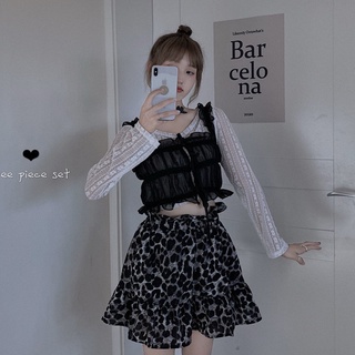 Jiashucheng Bộ Áo Ren Dài Tay + Chân Váy In Họa Tiết Da Báo Phong Cách Mới Cho Nữ