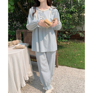 Bộ đồ ngủ JSC tay dài phối ren họa tiết kẻ sọc phong cách Nhật Bản thời trang xuân thu cho nữ