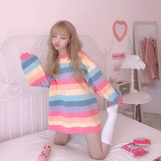 Jiashucheng Áo Thun Dài Tay Họa Tiết Sọc Cầu Vồng Thời Trang Dành Cho Nữ