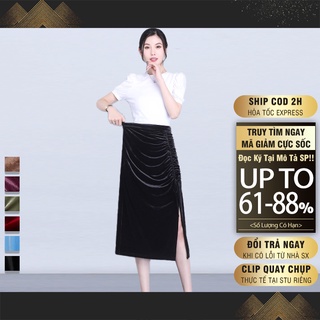 Chân váy chữ a meedi chất nhung thiết kế dài, dáng rộng xẻ tà phù hợp công sở Jisilk N.CVD-01