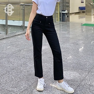 Quần đen nữ ống đứng cạp cao vải jeans co giãn basic - La’coba