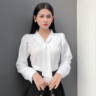 Áo sơ mi nữ Lachi trắng kiểu công sở dài tay form rộng cổ V thắt nơ gài ngọc có bigsize ASM04