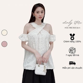 Áo kiểu nữ cổ yếm xoắn Linly Store thiết kế hở vai chất tơ hoa nổi A-CY4
