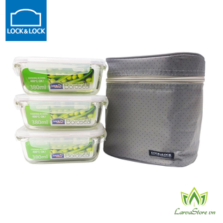 Bộ Hộp Cơm Lock&lock Thủy Tinh LLG422S4 380ml x 3 Túi Xám (Sử dụng tốt với lò vi sóng)