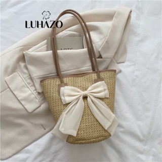 Túi cói đeo vai xách tay đi biển đính nơ sang chảnh quai da PU cao cấp phối màu tương phản đi chơi nổi bật LUHAZO