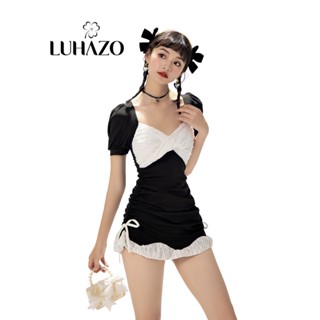 Đồ bơi đi biển nữ kín đáo LUHAZO 1 mảnh liền thân cộc tay ôm body có khóa kéo che khuyết điểm 2 màu đen trắng 8075 A-20