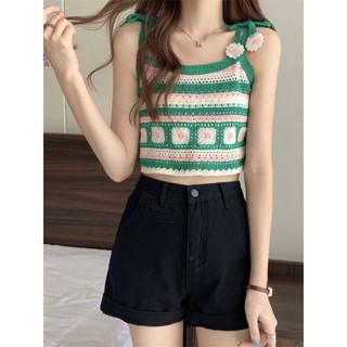 Áo bra móc len thủ công croptop dệt kim hai dây LUHAZO bikini đi biển kẻ ngang phối màu retro cá tính nổi bật A-