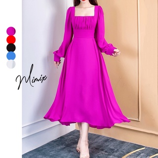Đầm nữ trơn tay dài bồng nhún ngực thắt eo MIMIX BG6195