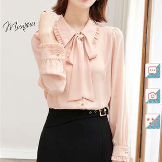 Áo sơ mi nữ công sở MUNXUU cổ nơ tháo rời kiểu cách, chất vải mềm mát - XU03 hồng